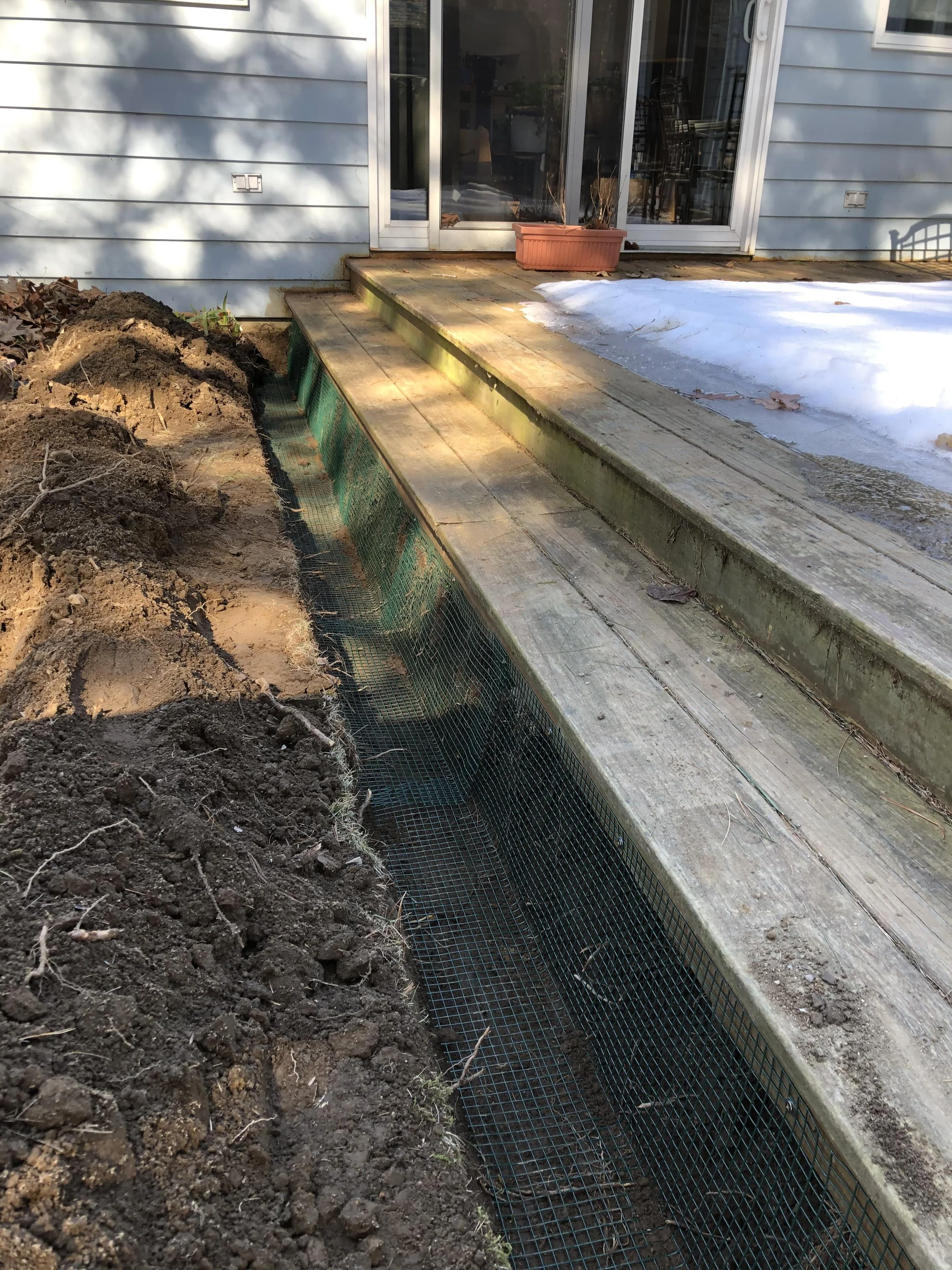 Installation in progress for burrow proof fencing for skunks living under deck